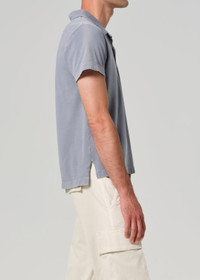Our classic polo silhouette crafted from a slub jersey that offers an artisanal, handmade look. This fit is true to size. Looks Like: Medium to light blue grey Feels Like: Lightweight, breathable organic cotton DETAILS Body Length: 26 3/4" Sleeve Length: 8" Model is 6'1" and wearing a size Medium Fabric Content: 100% Organic Cotton Care Instructions: Machine wash cold. Made in USA with imported materials MT129-1611_HEMA
