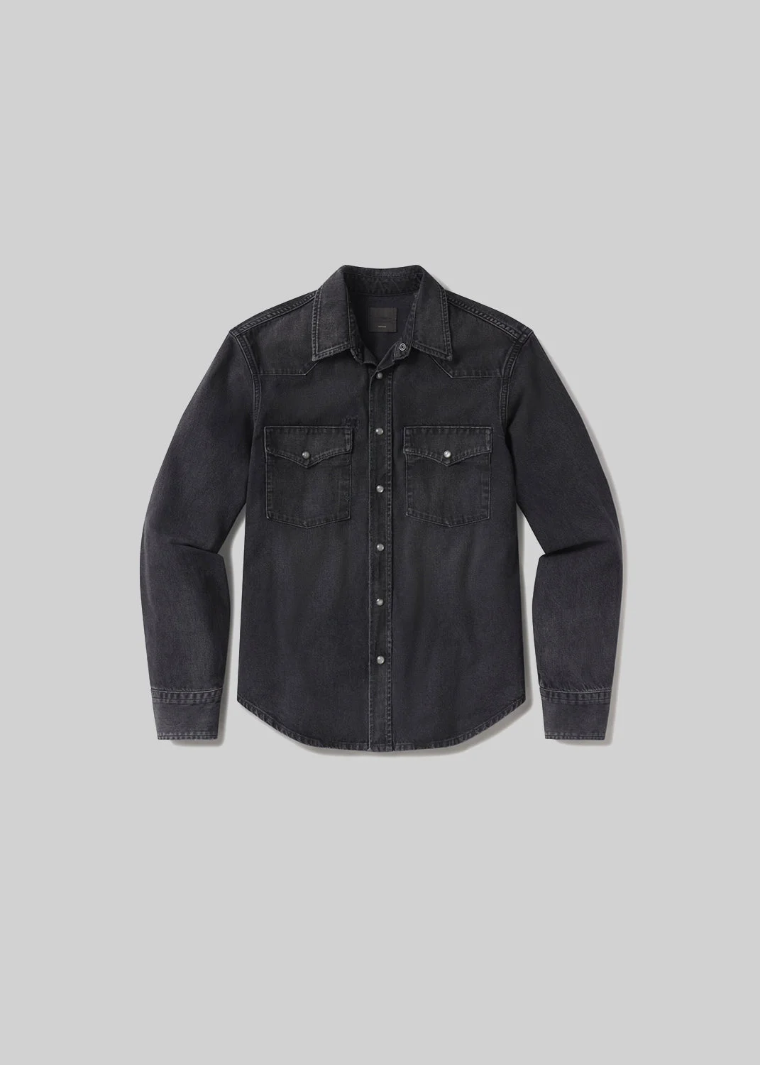 The ‘Western Shirt’ is a heritage-inspired staple, cut from midweight Japanese cotton chambray with a soft, non-stretch feel. Designed with classic western detailing and a clean button front, the marbled black wash adds depth and vintage character. Wear it layered or on its own for everyday ease. This fit is true to size. Looks Like: Washed out marbled black long sleeve button up collared shirt Feels Like: Midweight Japanese non-stretch cotton From our HUMANITY Collection DETAILS Body Length: 29" Sleeve Length: 25 1/4" Model is 6'1" and wearing a size Medium Fabric Content: 100% Cotton Care Instructions: Machine wash cold inside out with like colors. Do not bleach. Tumble dry low. Made in USA with imported materials M9029-1835-VINTB