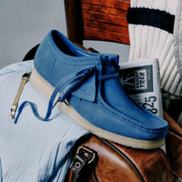 Step out in style with the vibrant Wallabee™ Seasonal Suedes, a fresh take on the iconic Wallabee™ designed to bring color and comfort to your wardrobe. The signature moccasin construction and hand-stitched apron seam ensure long-lasting comfort, while maintaining the classic Wallabee™ silhouette. - Steads blue suede upper - Two FOBS – Clarks Originals and Wallabee™ - Tow laces – Tonal first lace and second fleck lace - Natural pebble crepe - Clarks Originals logo foil embossed on sock - Moccasin construction - Hand stitched apron seam Materials Upper Material: Suede Lining Material: Unlined Sole Material: Crepe Midsole Material: EVA Fastening Type: Lace Sock Material: Leather