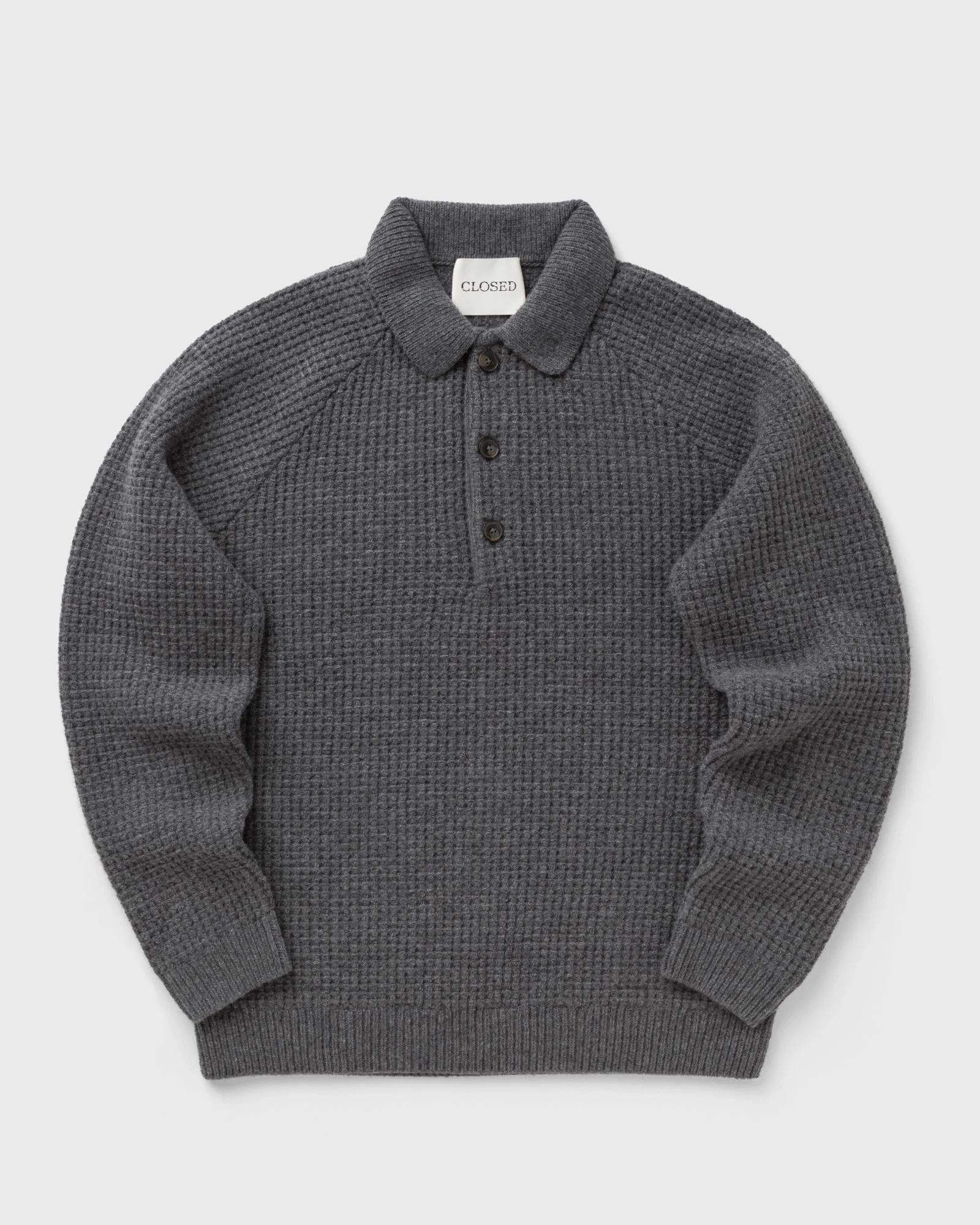 The Closed knit polo shirt is made from fine Italian wool with a natural finish. The regular fit is comfortable, while the classic polo collar and fine cuffs add timeless charm. - Fine knit with half patent and subtle patterns - Half button placket - Slightly dropped shoulders - Ribbed cuffs and hem Article number: C86442-98U-22-164 Gender: men Color: DARK GREY MELANGE Material: 100% Wool