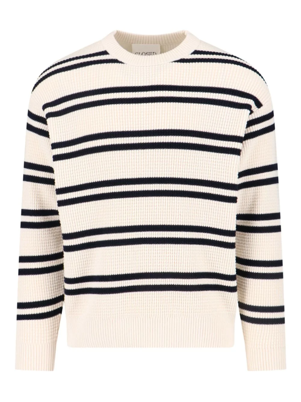 striped waffle-knit sweater Highlights - Cream - Horizontal stripes - Waffle knit - Crew neck - Long sleeves - Ribbed cuffs Imported Composition Wool 53%, Cotton 47% Washing instructions Read Manufacturer Guidelines