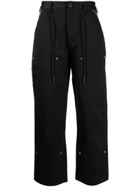 Carpenter leopard-print trim trousers black cotton leopard print trim silver-tone stud detailing logo patch to the rear belt loops wide leg drawstring waist concealed fly and button fastening two side inset pockets multiple patch pockets Imported Composition Cotton 100%