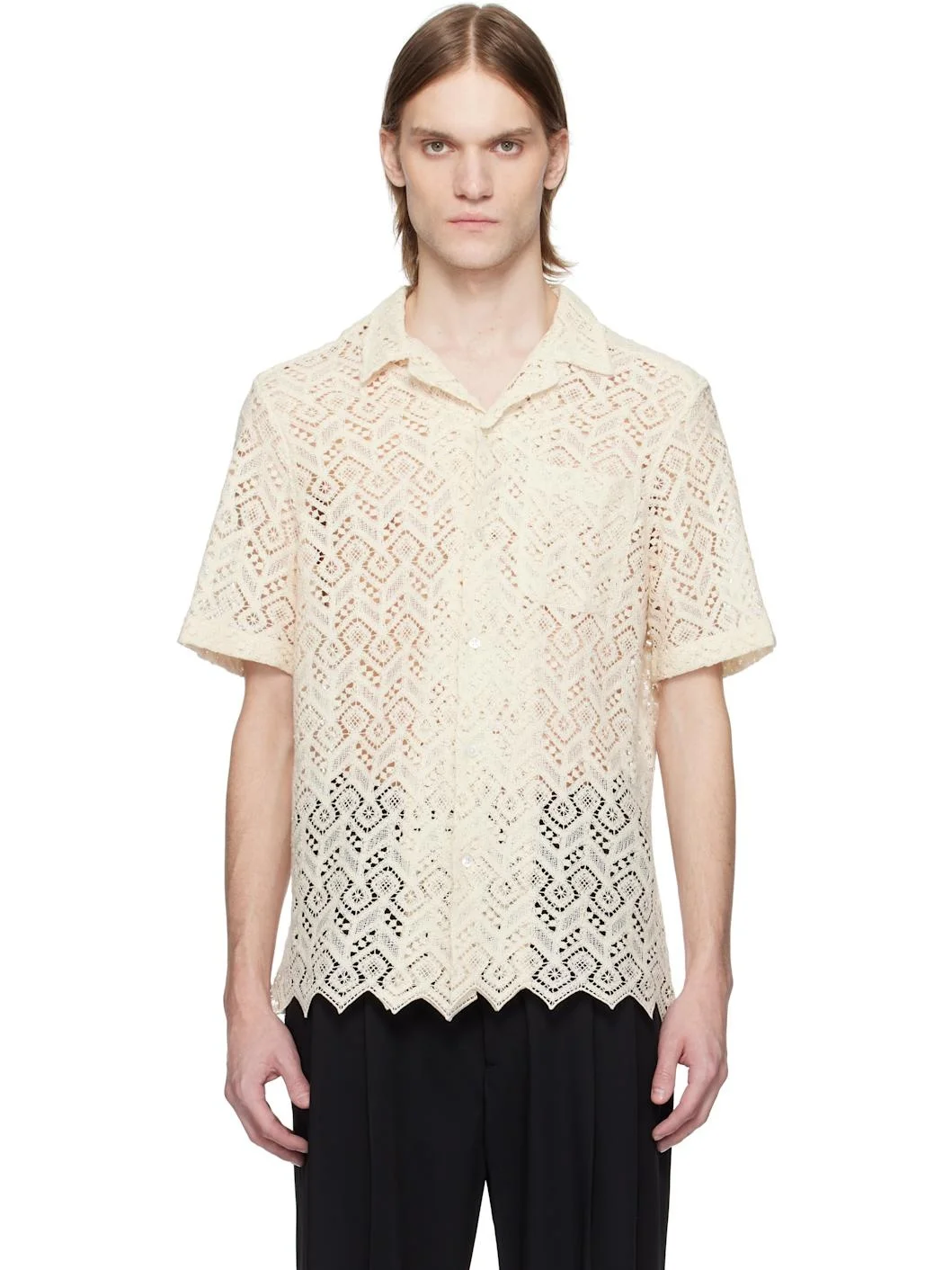 Semi-sheer crocheted cotton shirt. · Open spread collar · Button closure · Patch pocket · Scalloped edge at hem Supplier color: White 100% cotton. Made in Portugal 251756M192001
