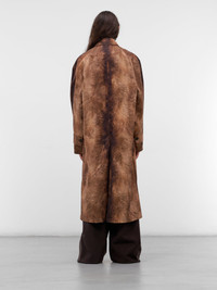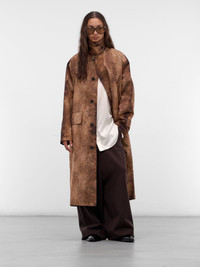 A brown poly mac coat with a trompe l’oeil fur print. The water-repellent finish and mid-length cut merge utility with optical illusion. Featuring: • Relaxed fit • Water-repellent poly construction • Trompe l’oeil fur print • Spread collar • Front button placket closure • Long sleeves • Side flap pockets and back vent • Mid length • Made in Portugal • 100% Polyester • Italian sizing Model is 5'11.5" wearing size 50. Shoulders: 18" Chest: 36" Waist: 30"