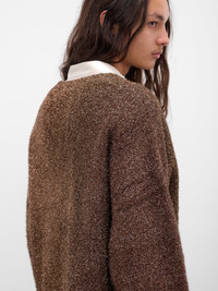 A bronze lurex-knit cardigan with a metallic sheen. The V-neckline and soft drape balance structure with subtle luminosity. Featuring: • Relaxed fit • Lurex yarn knit construction • Metallic finish • V-neckline • Front button closure • Long sleeves • Made in China • 100% Polyester • Standard sizing Model is 5'11.5" wearing size L. Shoulders: 18" Chest: 36" Waist: 30"