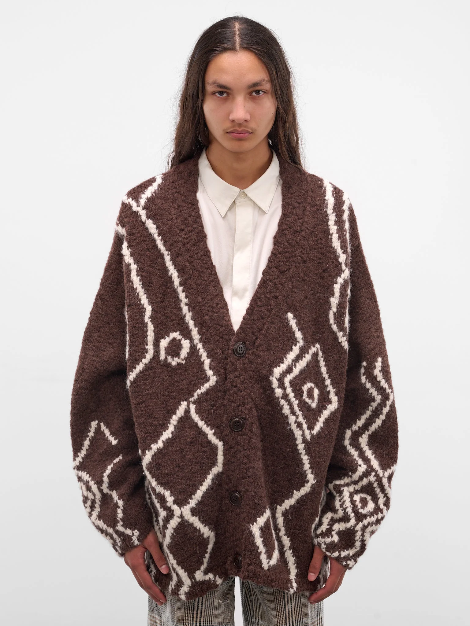 A brown alpaca-wool cardigan with jacquard patterning. The oversized silhouette and textured knit evoke a relaxed, graphic warmth. Featuring: • Oversized fit • Alpaca-wool blend knit construction • Jacquard graphic pattern • V-neckline • Front button closure • Long sleeves • Logo stitching at back • Made in China • 47% Alpaca 32% Nylon 21% Wool • Standard sizing Model is 5'11.5" wearing size M. Shoulders: 18" Chest: 36" Waist: 30"