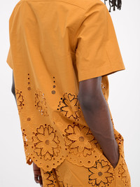 CMMN SWDN shirt in orange, paneled cotton construction, floral embroidered pattern, camp collar, front buttoned placket closure, short sleeves, chest patch pocket, scalloped hem, boxy fit. Made in Portugal 100% Cotton European Sizing Model is 6’2” wearing size 48. Shoulders: 19” Chest: 38” Waist: 28”