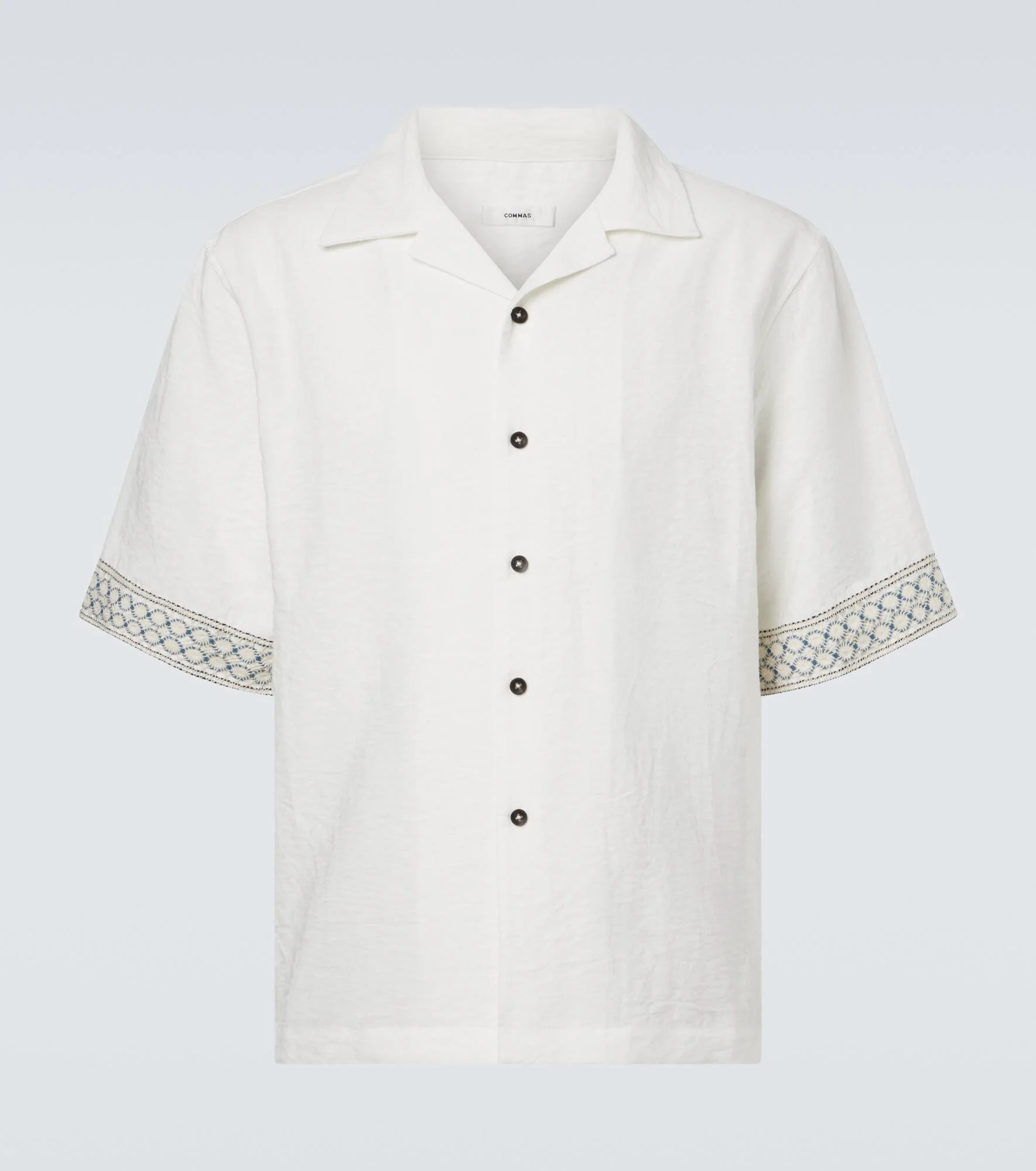 Clean lines and a muted aesthetic are the order of the day for Sydney-based resort and swimwear label Commas. Crafted from a lightweight fabric, this bowling shirt features crochet-trimmed sleeves for a delicate finishing touch. Product Details - Material: 65% polyester (recycled), 35% linen - Care instructions: dry clean - Made in China - Designer color name: White - Item color: white - Collar: Cuban - Closure: buttoned front - Item number: P01138102 Size & Fit - True to size - Without pleats in the back - Designed for a loose fit - Non-stretchy fabric - Falls below the hip - Height of model is 189cm-74.5" and wears a size L