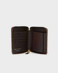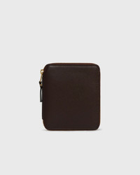 This classic wallet from Comme des Garcons is made in Spain from high-quality cowhide and features a gold-colored zipper and gold foil logo. - Zip closure - Four card slots - Coin pocket - Compartment for banknotes - Dimensions: 12.5cm x 10.5cm Article Number: SA2100-801 Gender: Men Color: BROWN Material: 100% Leather