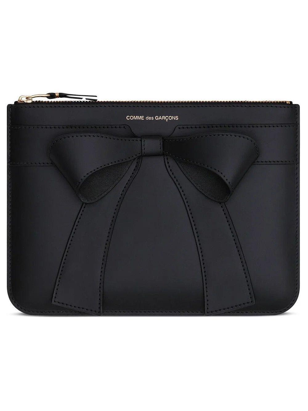 SA5100BB Big Bow Wallet in Black from Comme des Garcons Wallet Highlights - black - bow detail - embossed logo stamp in the front - cold-tone top zip closure - clutch/wallet - one big compartment Measurements Length: 22 cm Width: 16 cm Thickness: 1.5 cm Made in Spain Designer ID: SA5100BB Materials 100% COWHIDE
