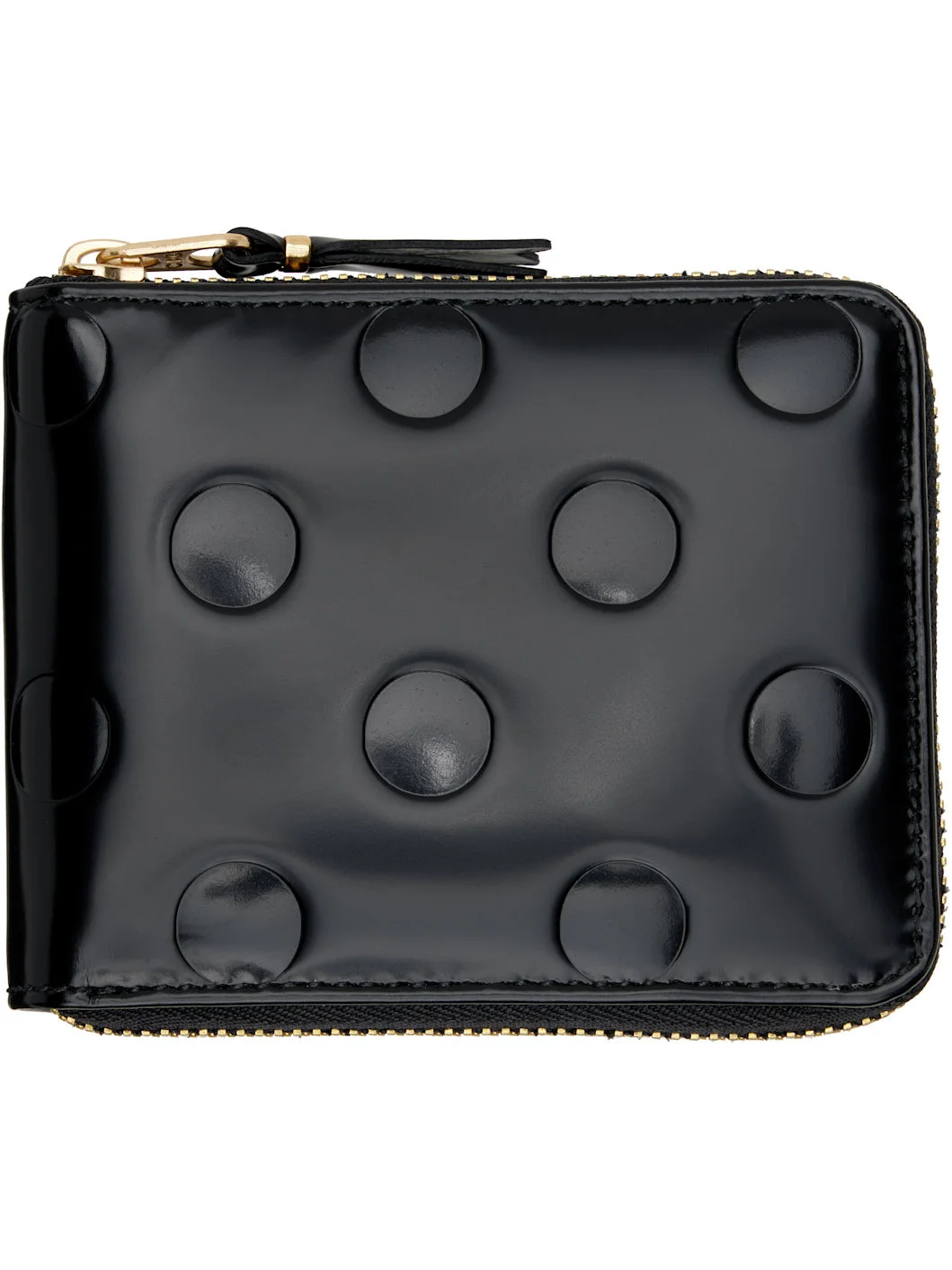Polished leather bifold wallet. · Polka-dot pattern embossed throughout · Zip closure · Three card slots at interior · Two patch pockets and one note slot · One coin compartment · Unlined · H3.5" x W4.25" x D1" Supplier color: Black Leather. Made in Spain 252230M164017