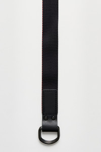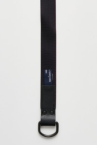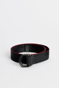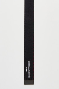 Belt from Comme des Garcons Homme. Made in Japan from nylon and leather with a metal buckle featuring a double-ring design for an adjustable fit. Designed with subtle colored thread trimming along the edge and branding at the end tip. Details Black and red belt. Made in Japan from nylon, leather and metal.ART. NO: HN-K301-051-1 Size & fit Adjustable size. Measures 129 x 3 cm.