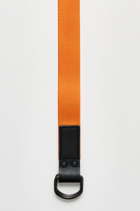 Belt from Comme des Garcons Homme. Made in Japan from nylon and leather with a metal buckle featuring a double-ring design for an adjustable fit. Designed with subtle colored thread trimming along the edge and branding at the end tip. Details Orange and red belt. Made in Japan from nylon, leather and metal.ART. NO: HN-K301-051-3 Size & fit Adjustable size. Measures 129 x 3 cm.