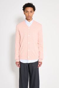 Knitted cardigan from Comme des Garçons Play. Made from a soft wool yarn in a stretch knit. Features a V-neck collar and mother of pearl button front closure. Ribbed cuffs and hemline. Small contrast embroidered logo patch at the left cuff. Details Light pink cardigan. Made in Japan from 100% wool. Art. No: AX-N092-051 5 ART. NO: AX-N092-051 5 Size & fit Regular fit with V-neck collar. Model wears a size Large and measures 188 cm with a 96 cm chest.