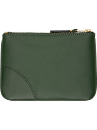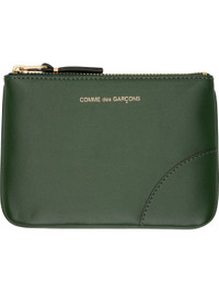 Buffed leather card holder in green. · Logo stamp at face · Zip closure · Unlined · Gold-tone hardware · H4" x W5.5" Supplier color: Bottle green Leather. Made in Spain 252230M164004