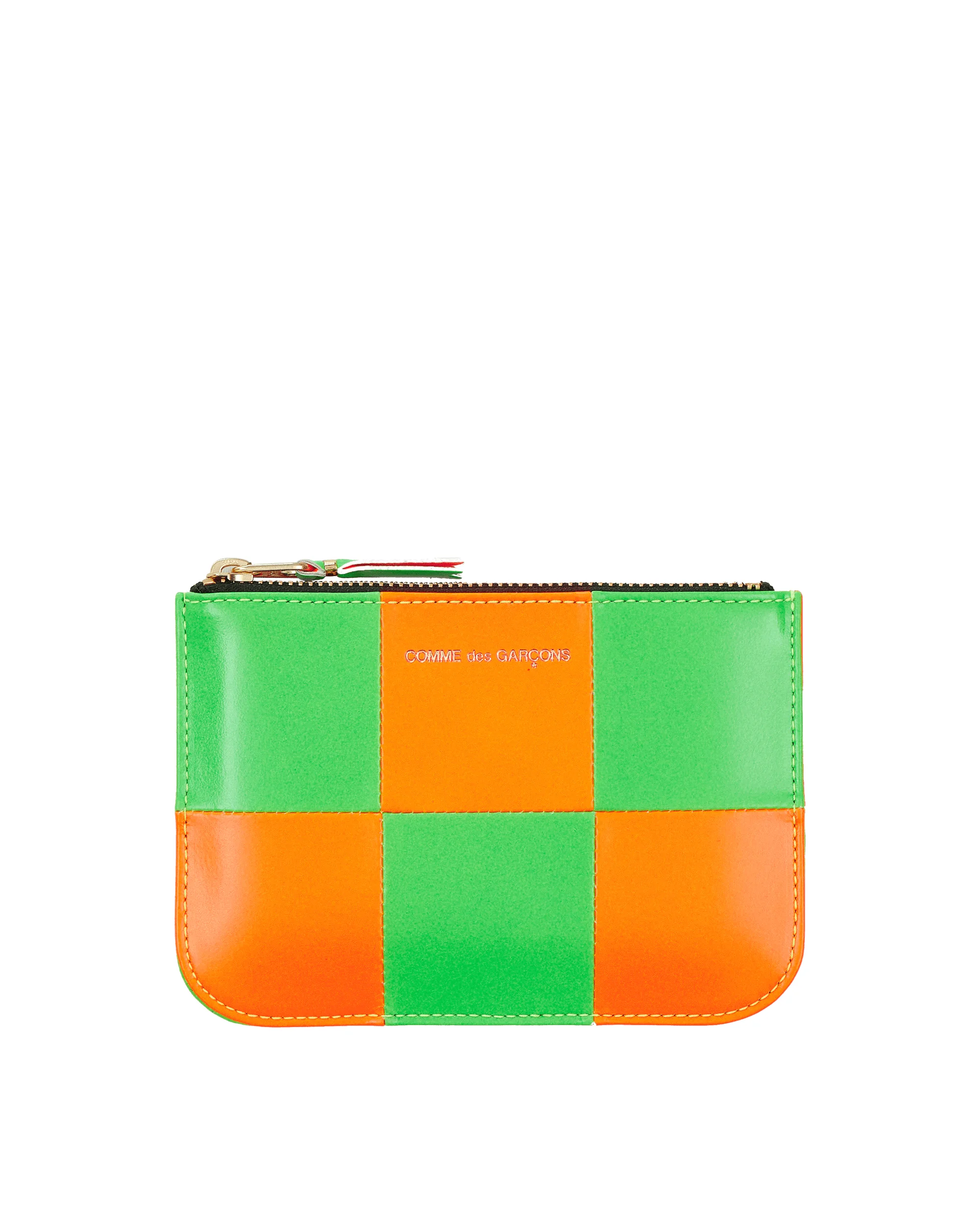 Comme Des Garçons Wallet Fluo Light Orange/ Green Bags and Backpacks Pouches - 100% Goat Leather - Top Zip Closure - Inner Compartment - Printed Branding - Style Code: SA8100FS 1 SIZE & FIT 10.5cm Height, 14.5cm Width.