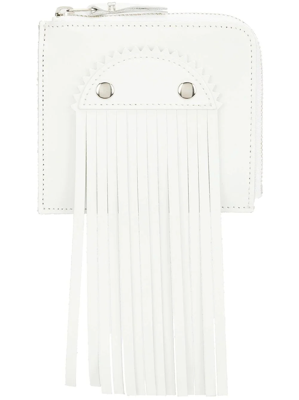 fringed cardholder White leather fringed cardholder from Comme Des Garcons Wallet. Imported Composition Calf Leather 100% SIZE & FIT Measurement WIDTH 4.33 in(11 cm) LENGTH 3.93 in(10 cm) DEPTH 0.78 in(2 cm)