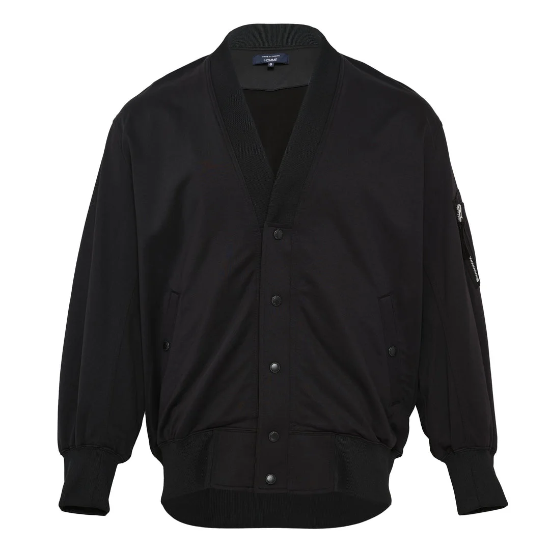 600078949BLK00L / HQ-T007/051/1/1A - Cotton blend construction - Button-front closure - Ribbed collar, cuffs, and hemline - Bomber-style silhouette - Long sleeves - Relaxed oversized fit - Side zippered pocket detail COMME des GARCONS HOMME Black Cotton Blend Button Cardigan delivers avant-garde minimalism with sophisticated tailoring and contemporary construction. Crafted from premium cotton blend fabric in deep black, featuring a relaxed bomber-style silhouette with ribbed collar, cuffs, and hemline. The versatile button-front closure and oversized fit create a modern layering piece that embodies the brand's deconstructed aesthetic.