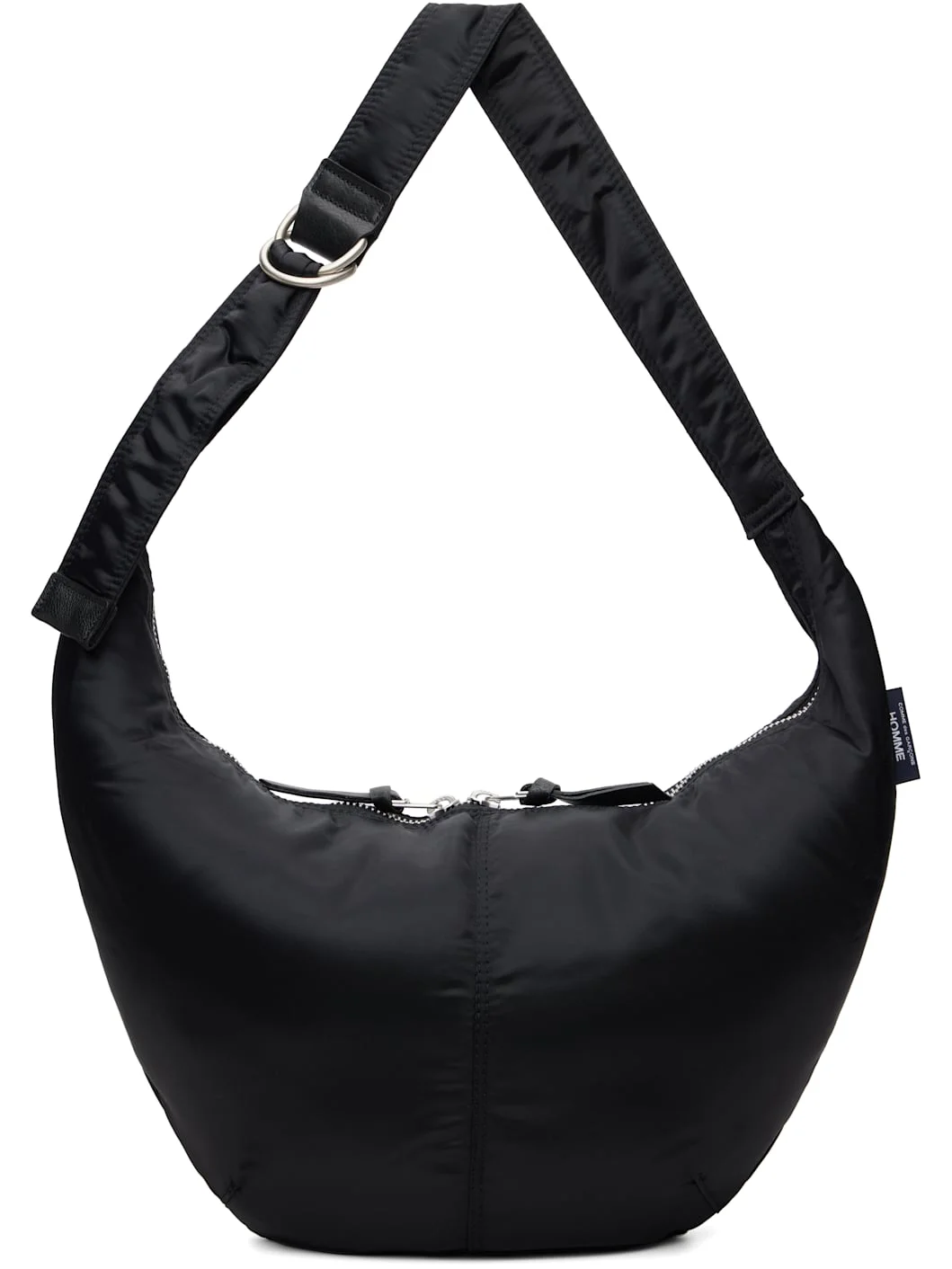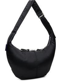 Satin messenger bag. · Leather trim throughout · Adjustable crossbody strap · Logo flag at side · Two-way zip closure · Patch pocket at interior · Camo-patterned lining · H11" x W19" x D4" Supplier color: Black Textile. Made in Japan 252057M170005