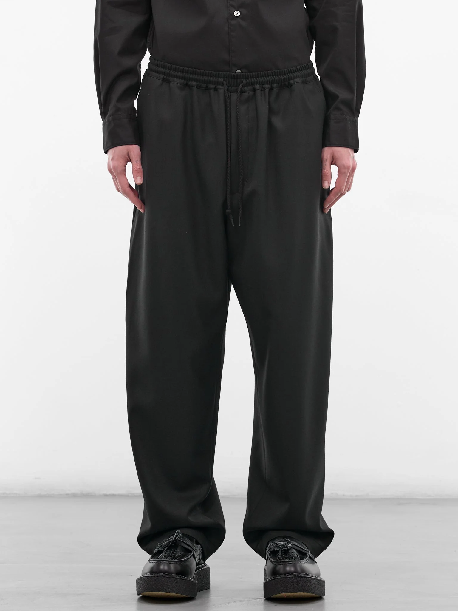 Relaxed fit pants in black wool with elasticated waistband and wide leg. Featuring: • Relaxed fit • Elasticated waistband • Adjustable drawstring • Concealed fly • Four-pocket styling • Wide leg • Made in Japan • 100% Wool • Standard sizing Model is 6'0" wearing size M. Shoulders: 17.5" Chest: 34.5" Waist: 29"