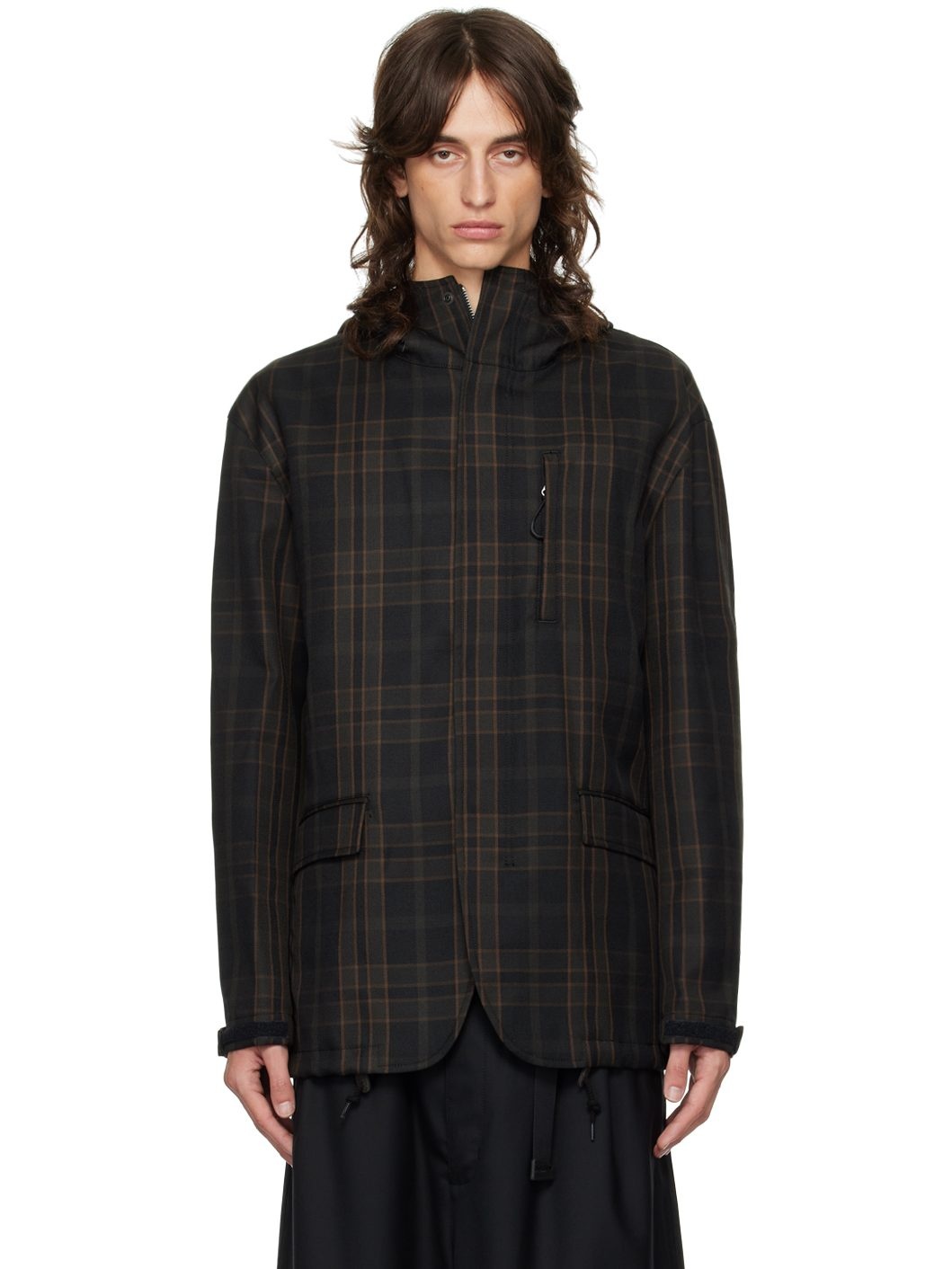 Wool twill jacket. Check pattern throughout. · Hood at stand collar · Zip closure with press-stud placket · Zip pocket · Flap pockets · Concealed drawstring at hem · Adjustable velcro tab at cuffs · Welt pocket at interior Supplier color: Black/Green/Yellow