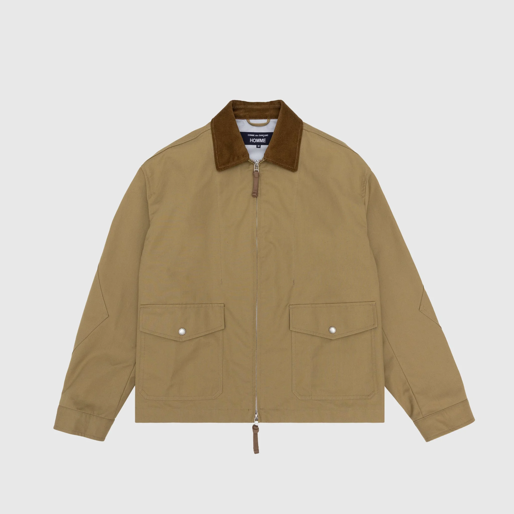 - HP-J009-051-2 - Beige - 70% Cotton, 30% Nylon - Triple-layer construction - Front two-way zipper closure - Two front pockets with a flap and a snap button closure - Adjustable snap button cuffs - Adjustable waist adjusters - Corduroy collar - Elbow patches - FW25 - Made in Japan