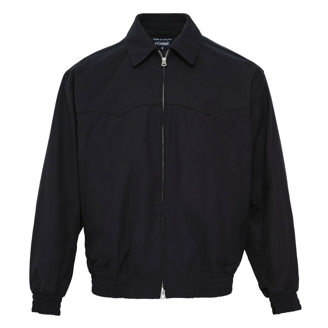 600078923NVY00L / HQ-J007/051/2/1A - Full zip closure with metal hardware - Structured point collar - Ribbed cuffs and hem - Side entry pockets - Cotton construction - Regular fit COMME des GARCONS HOMME Cotton Zip-Up Collar Jacket delivers minimalist sophistication with signature deconstructed tailoring. Crafted from premium cotton in classic black, featuring a structured collar and full-zip closure with ribbed cuffs and hem. The clean architectural silhouette embodies the brand's avant-garde approach to contemporary menswear.