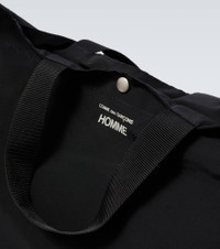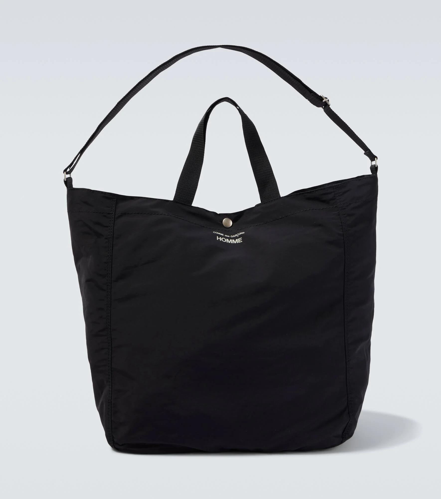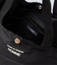 Store your essentials in this tote bag from Comme des Garcons Homme. Made from grosgrain fabric, this compact design has a top handle and a shoulder strap, complete with logo lettering at the front for a signature finish. Product Details - Material: cotton, nylon - Lining: fabric - Made in Japan - Designer color name: Black - Item color: black - Closure: snap-buttoned fastening - Top handle, Adjustable shoulder strap - Internal details: single compartment, internal slot pocket - Item number: P01098204 Size & Fit - Height 40cm-15.5" - Width 51cm-20" - Depth 19cm-7.5" - Length of handles 37cm-14.5" - Adjustable shoulder strap - Min. length shoulder strap 65cm-25.5" - Max. length shoulder strap 121cm-47.5"
