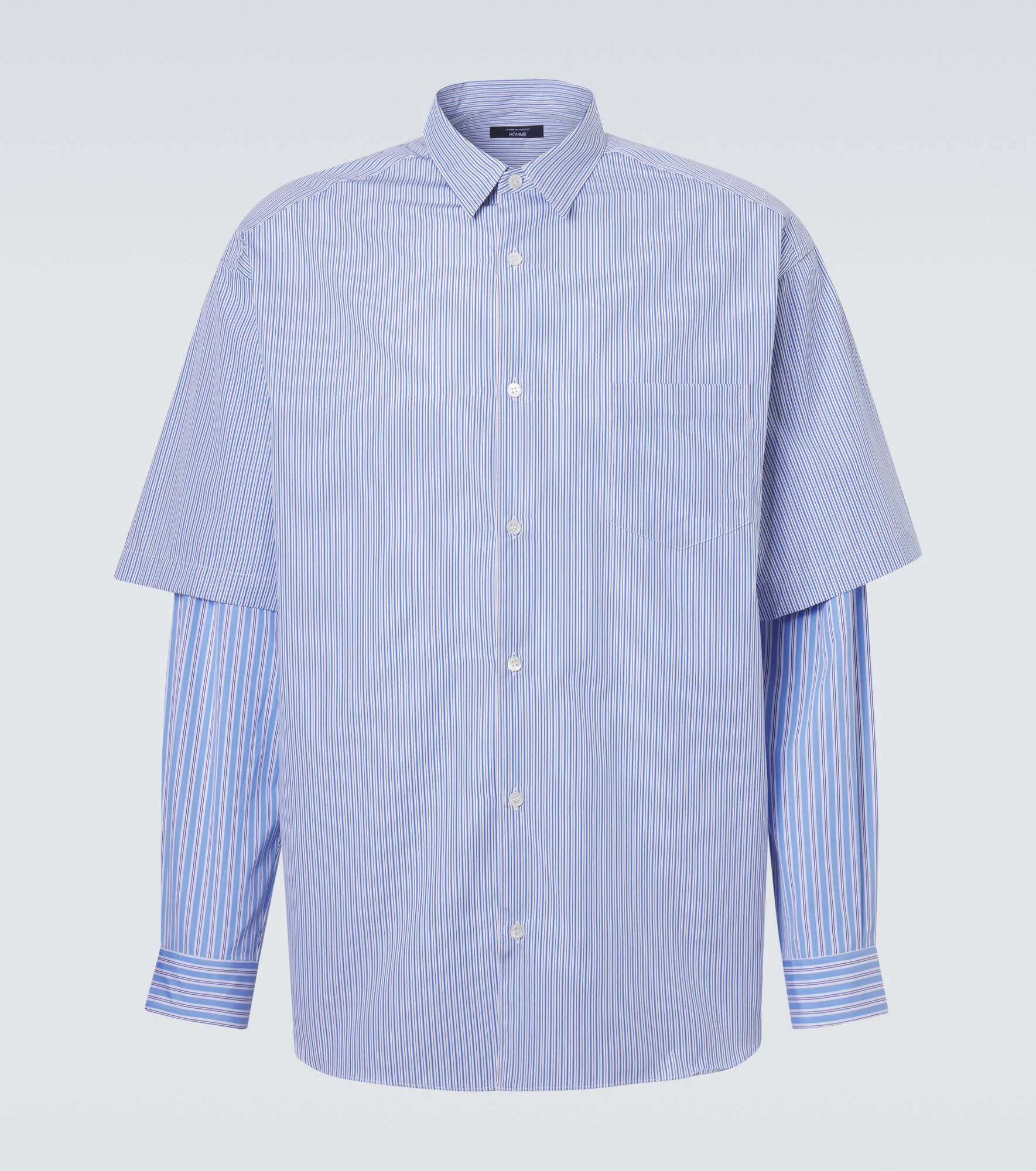 Comme des Garcons Homme is celebrated for its deconstructed take on menswear essentials. Crafted from pure cotton poplin, this layered shirt design features all-over stripes. Product Details - Material: 100% cotton - Care instructions: hand wash - Made in Japan - Color: blue - Designer color name: Wh/Sx/Nyxwh/Sx/Ny - Collar: classic (Straight point) - Closure: buttoned front - Pockets: breast pocket - Cuff: buttoned - Item number: P01164518 Size & Fit - True to size - Dropped shoulders - With pleats in the back - Designed for a loose fit - Non-stretchy fabric - Falls below the hip - Height of model is 189cm-74.5" and wears a size L
