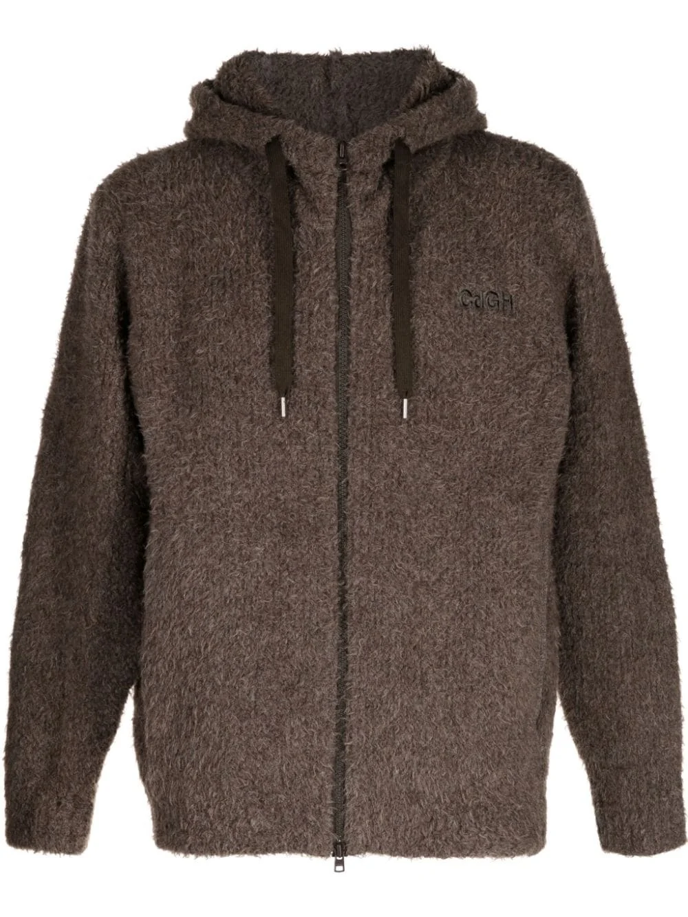 logo-embroidery hooded jacket Highlights - Dark grey - Wool blend - Embroidered logo - Drawstring hood - Front zip fastening - Long sleeves - Straight hem Imported Composition Wool 88%, Polyester 12% Washing instructions Dry Clean Only