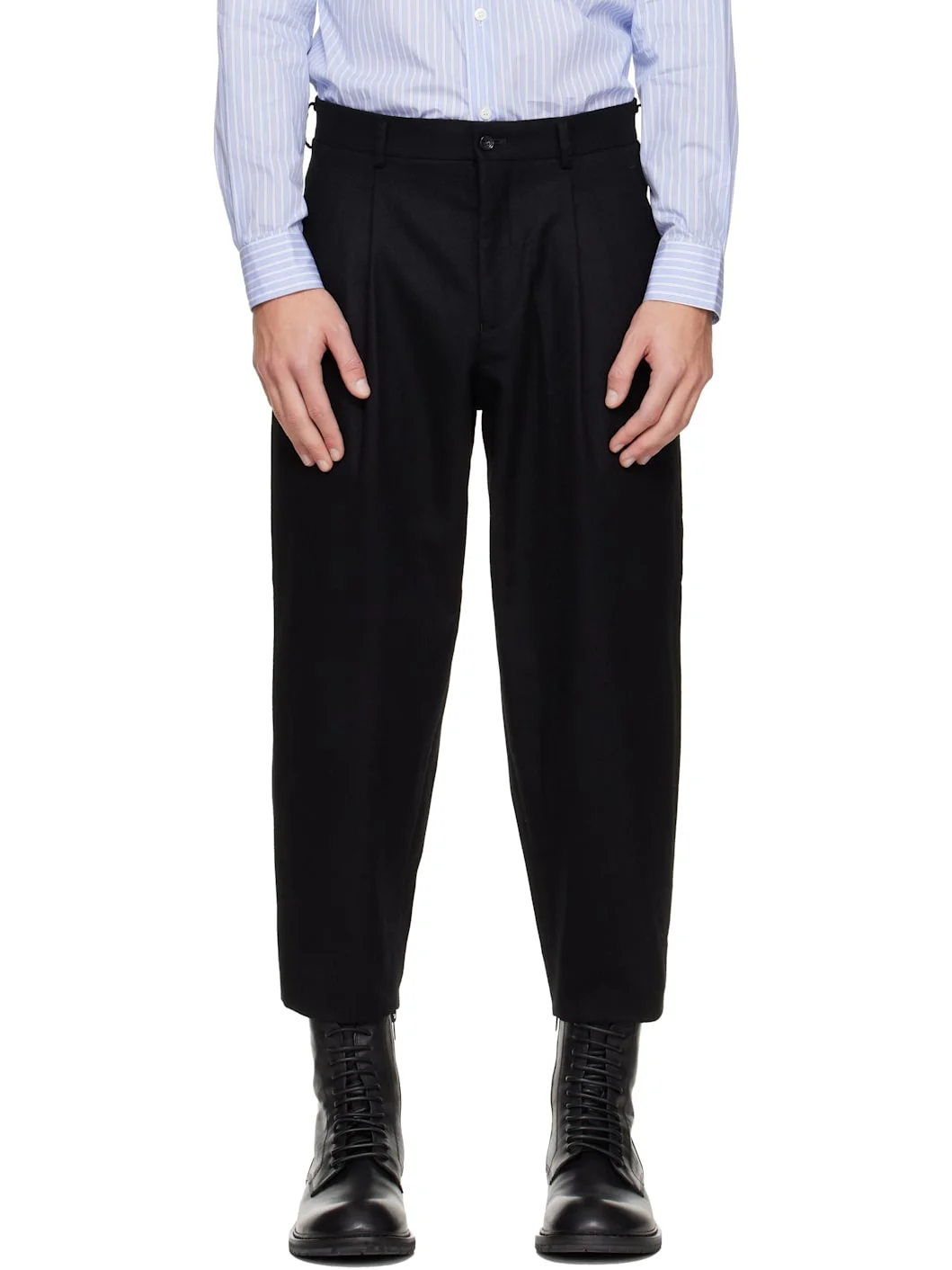 Wool-blend melton trousers. · Belt loops · Four-pocket styling · Zip fly · Pleats at front · Partial satin lining Supplier color: Black Body: 90% wool, 10% nylon. Lining: 100% cupro. Made in Japan 252347M191002