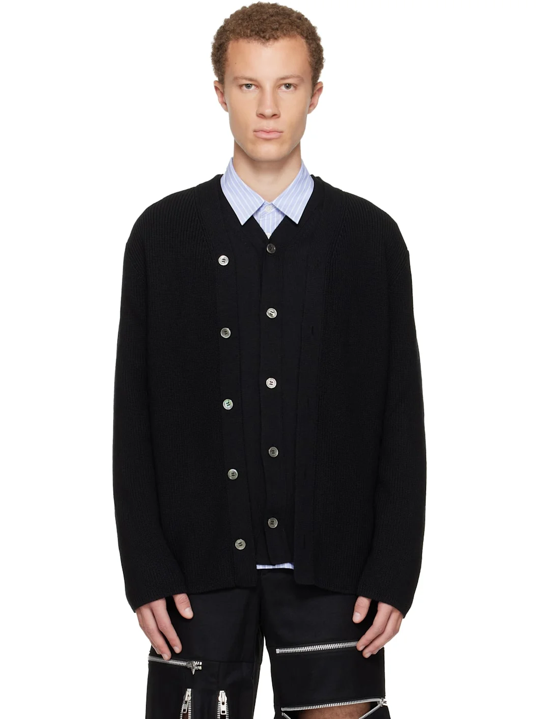 Rib-knit wool cardigan. · Integrated vest underlay with Y-neck and button closure · Y-neck · Button closure · Exposed seams at back Supplier color: Black 100% wool. Made in Japan 252347M200002