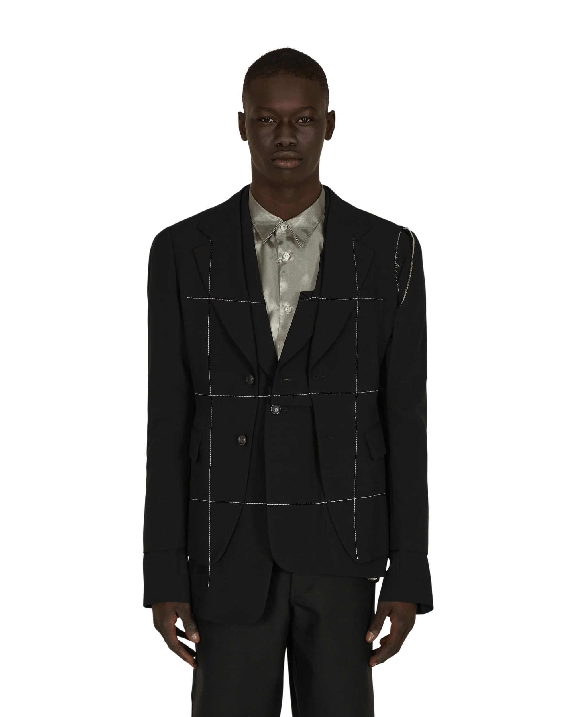 Comme Des Garçons Homme Plus Jacket Black Coats and Jackets Blazers - 100% Wool - Lining: 100% Cupro - Panelled Construction - Notched Lapel Collar - Chest Pocket - Button Closure - Contrast Stitching at Front - Two Pockets at Waist - Distressed Details at Sleeves - Button Cuffs - Made in Japan - Style Code: PG-J049-S21 1 SIZE & FIT Model is 6ft 1in/1.85m with 34"/86cm chest and wears size M. Measures (Size M): 45cm Shoulders, 51cm Chest, 73cm Sleeve, 79cm Length, 54cm Hem.