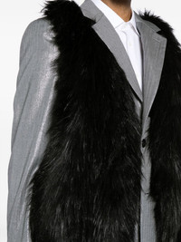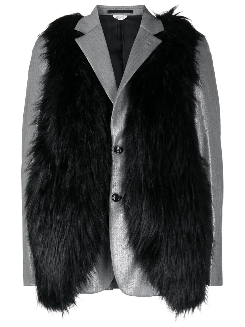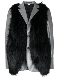 faux-fur wool blazer Highlights - Black/grey - Wool - Faux-fur detailing - Metallic finish - Front button fastening - Classic lapels - Long sleeves - Straight hem Imported Composition Lining: Cupro 100% Base: Polyester 100% Acrylic 100% Outer: Wool 100% SIZE & FIT Model measurements Height 6 ft 2 in(1.88 m) Bust/Chest 31.88 in(81 cm) Hips 35.82 in(91 cm) Waist 27.55 in(70 cm) FittingInformation Designed to be unstructured, offering a loose fit throughout The internal shoulder pads offer a structured shape Made from a heavyweight non-stretch fabric This piece fits true to size – take your usual size