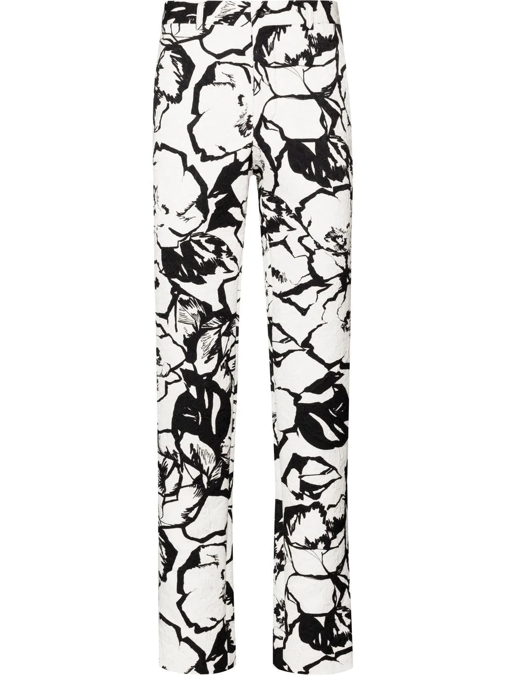 Slim fit trousers by Comme des Garçons Homme Plus made of cotton and viscose brocade fabric with a floral motif. Low-rise cut with tapered leg, zip fly with top button, side slanted pockets, rear welt pockets including one with button flap. The model is 187 cm tall and wears a size M. Season: SPRING - SUMMER Motive: Pattern Composition: 71% cotone 29% rayon