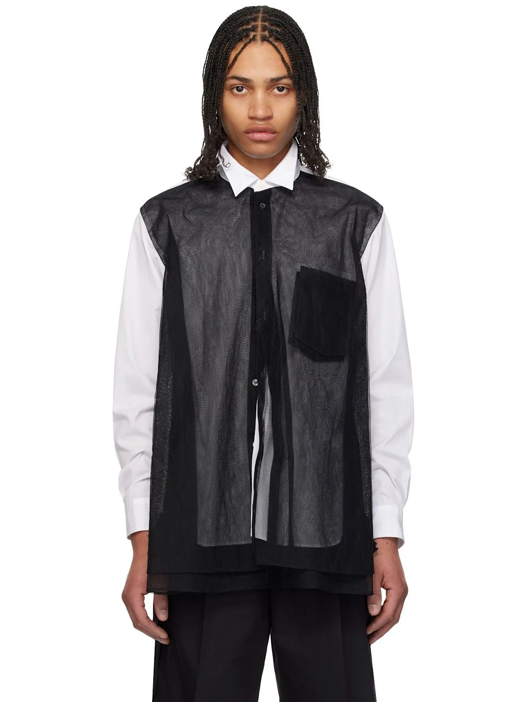 Cotton poplin and nylon tulle shirt. - Layered construction - Spread collar - Button closure - Patch pockets at chest - Shirttail hem - Single-button barrel cuffs - Twin pleats at back yoke - Mother-of-pearl hardware Supplier color: White/Black