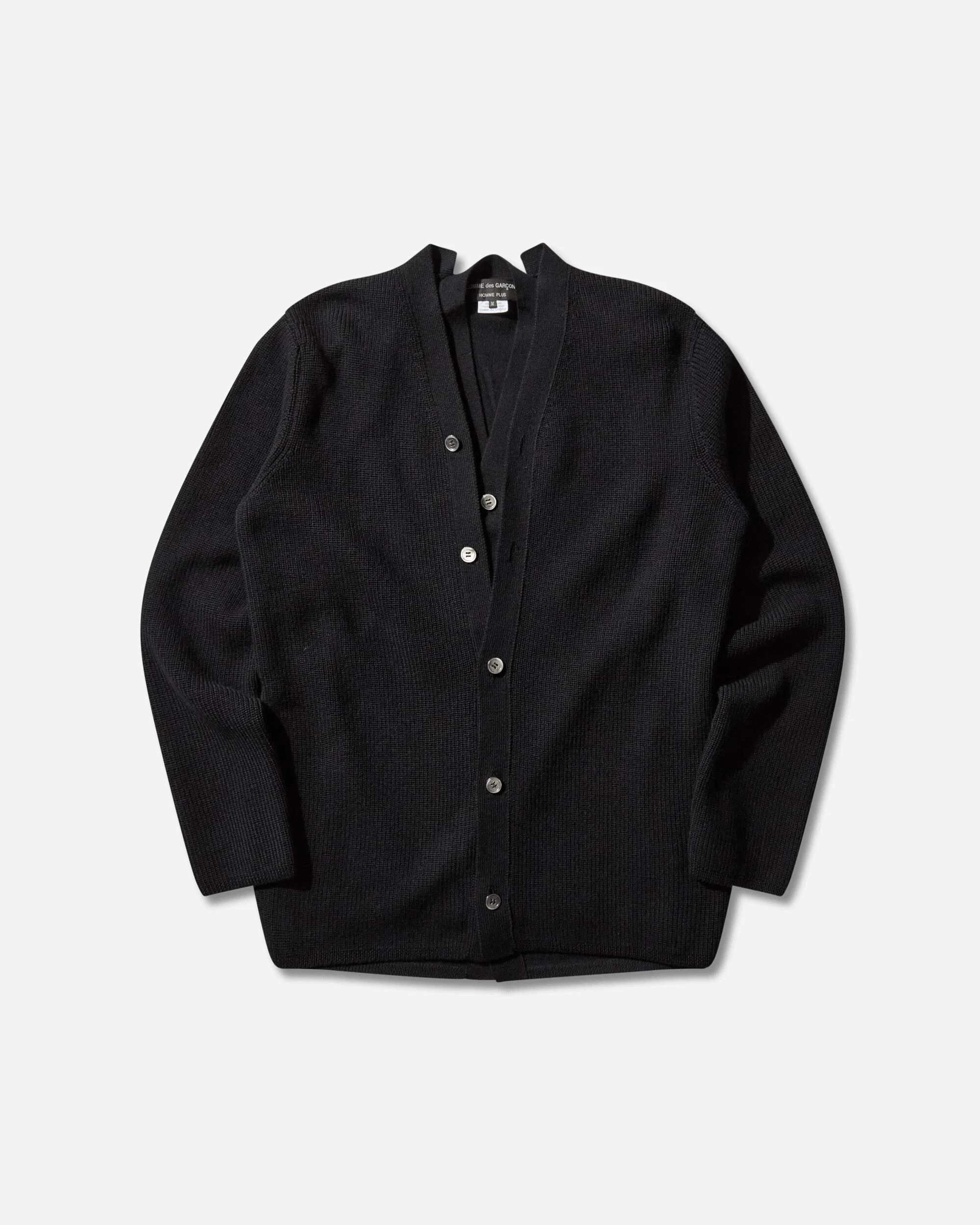 Comme des Garcons HOMME PLUS Double Layered Wool Cardigan Black Wearing CdG Homme Plus means adding an avant-garde and inimitably experimental touch to your wardrobe. Double layered wool cardigan with v-neck, button closure and ribbed knit panel. - 100% Wool - Loose Fit - Double-Layered Construction - V-Neck - Button Closure - Made in Japan - Style Code: PP-N007-W25 1
