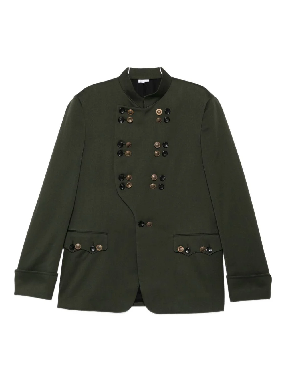 double-breasted button-detail jacket Highlights - Green - Double-breasted closure - Stand-up collar - Button embellishments - Flap pockets - Long sleeves Imported Composition Wool 70%, Cotton 30% Washing instructions Read Manufacturer Guidelines