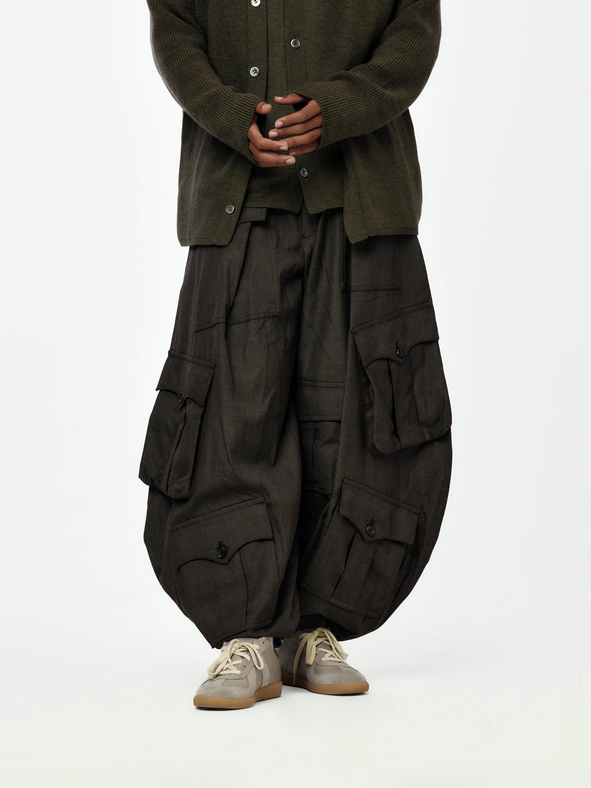 Comme des Garcons Homme Plus redefines proportion and presence with these wide balloon pants, crafted with Kawakubo’s signature play on form and volume. Constructed from textured cotton-blend fabric and detailed with oversized cargo pockets, the silhouette bridges avant-garde tailoring and utility design. The exaggerated shape moves with intent — grounded, expressive, and unapologetically Comme. SKU: PP-P001-051-1