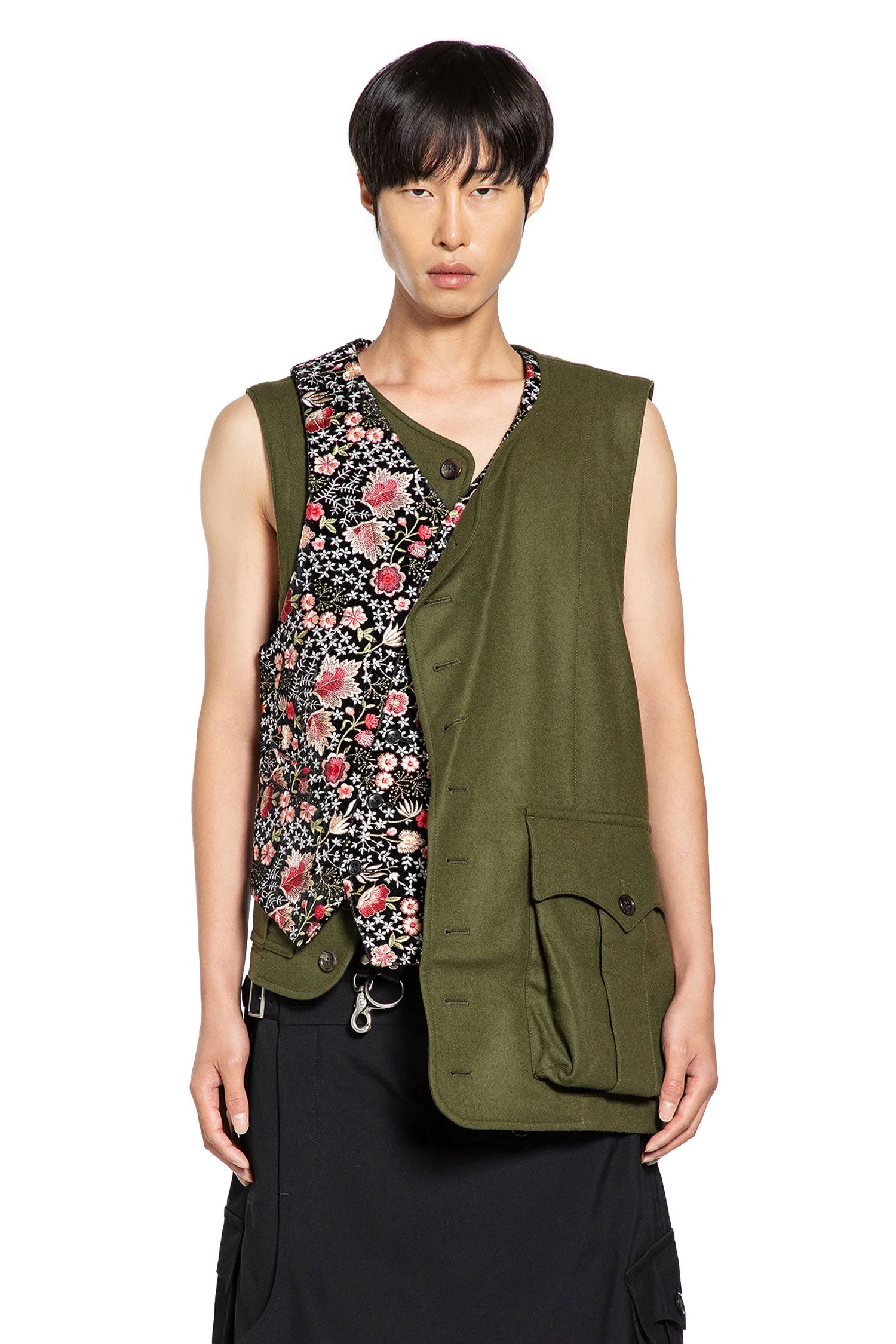 DESCRIPTION - Runway Style - Multicolor - Khaki/multicolor - Wool felt and embroidered cotton canvas - Spliced panels - Asymmetric v-neck - Twisted button closure - Asymmetric side button flap pockets - Sleeveless - Asymmetric hem DETAILS - Made in: Japan - Composition: 50% Cotton 50% Polyester 100% Wool - Model code: PPV001W25 1 - Item ID: 9882640843094 SIZE & FIT Model wears size M Model Height 188 cm Chest 88 cm Waist 69 cm Hips 88 cm