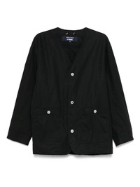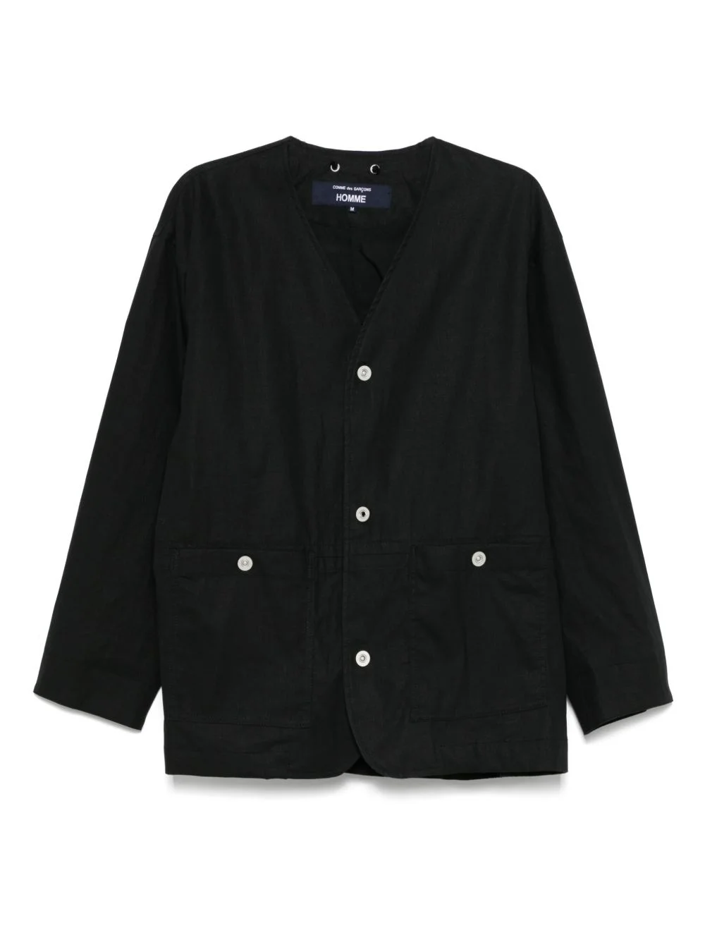 V-neck jacket Highlights - Black - Front button fastening - Two front patch pockets - Collarless - Buttoned cuffs Imported Composition Outer: Linen/Flax 55%, Cotton 45% Lining: Cotton 80%, Nylon 20%
