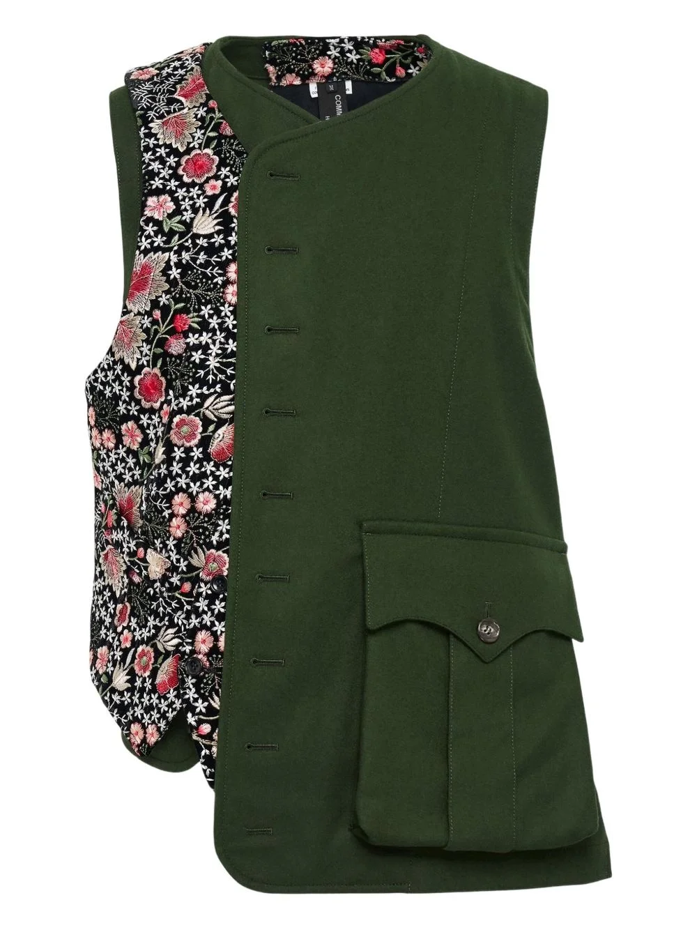 floral-motif panelled vest Highlights - Green/multicolour - Floral motif - Button fastening - Sleeveless - Flap pocket - Asymmetric hem Imported Composition Fabric 100% Washing instructions Read Manufacturer Guidelines