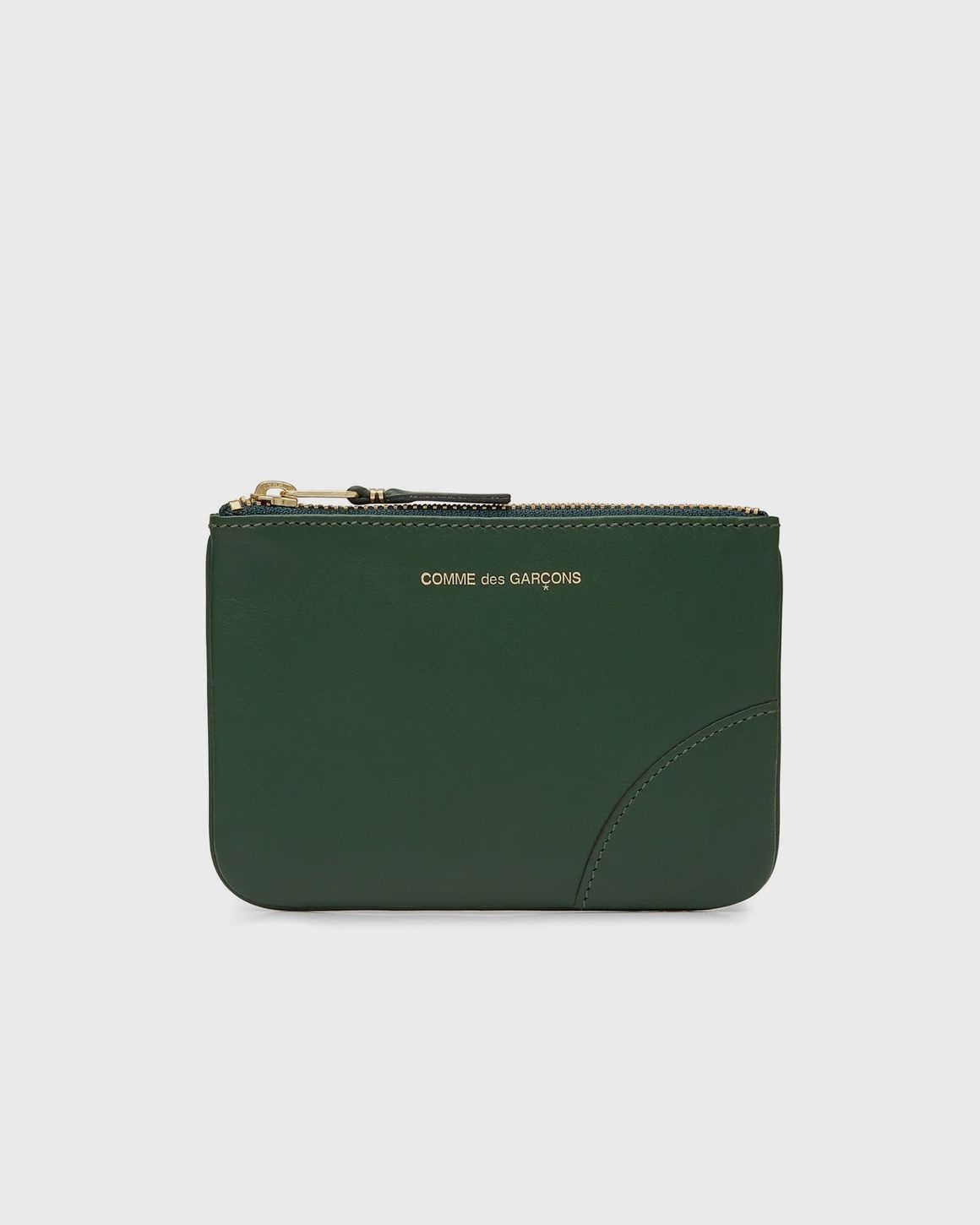 This classic wallet from Comme des Garçons is made in Spain from high-quality cowhide and features a gold-colored zipper and a gold foil logo. - Zip closure - Gold foil logo - Dimensions: 14.5cm x 10.5cm Article Number: SA8100-BOTTLE-GREEN Gender: Men, Women Color: BOTTLE GREEN Material: 100% Leather