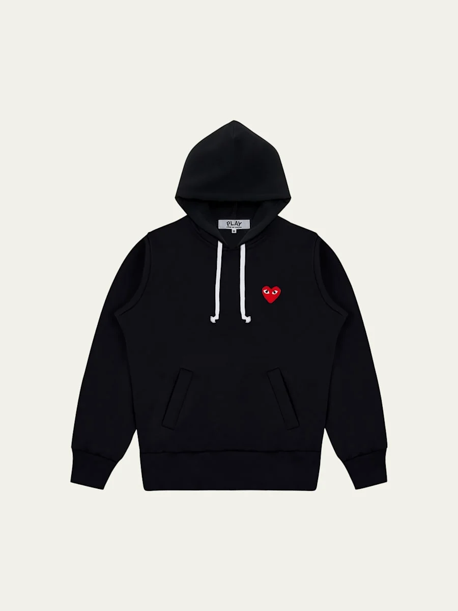 Comme des Garcons "Play" sweatshirt with signature heart graphic at chest. Hooded drawstring neckline. Kangaroo pocket. Banded cuffs and hem. Pullover style. Polyester. Imported.