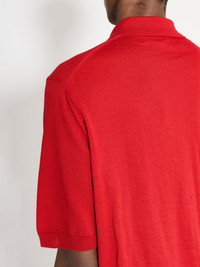 Polo t-shirt from Comme des Garçons PLAY. Made in Japan from a smooth wool fabric. Features a ribbed spread collar, top button closure and contrasting sewn-on logo patch on the chest. Short sleeves with ribbed cuffs and ribbed straight hem. Details Red polo t-shirt. Made in Japan from 100% wool. Art. No: P1N094-5 ART. NO: P1N094-5 Size & fit Model wears a size M and measures 184 cm with a 83 cm chest.
