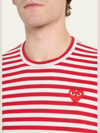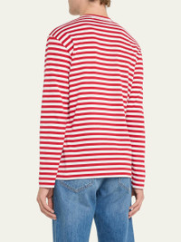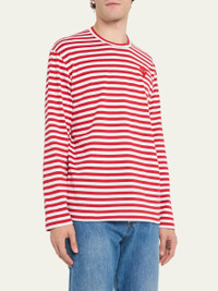 Comme des Garcons striped T-shirt. Crew neckline. Heart graphic at chest. Long sleeves. Straight hem. Pullover style. Cotton. Imported. Model is 6'1"/185cm. Online Inquiries: BGS21_N79Q4| Store Inquiries: #2303047