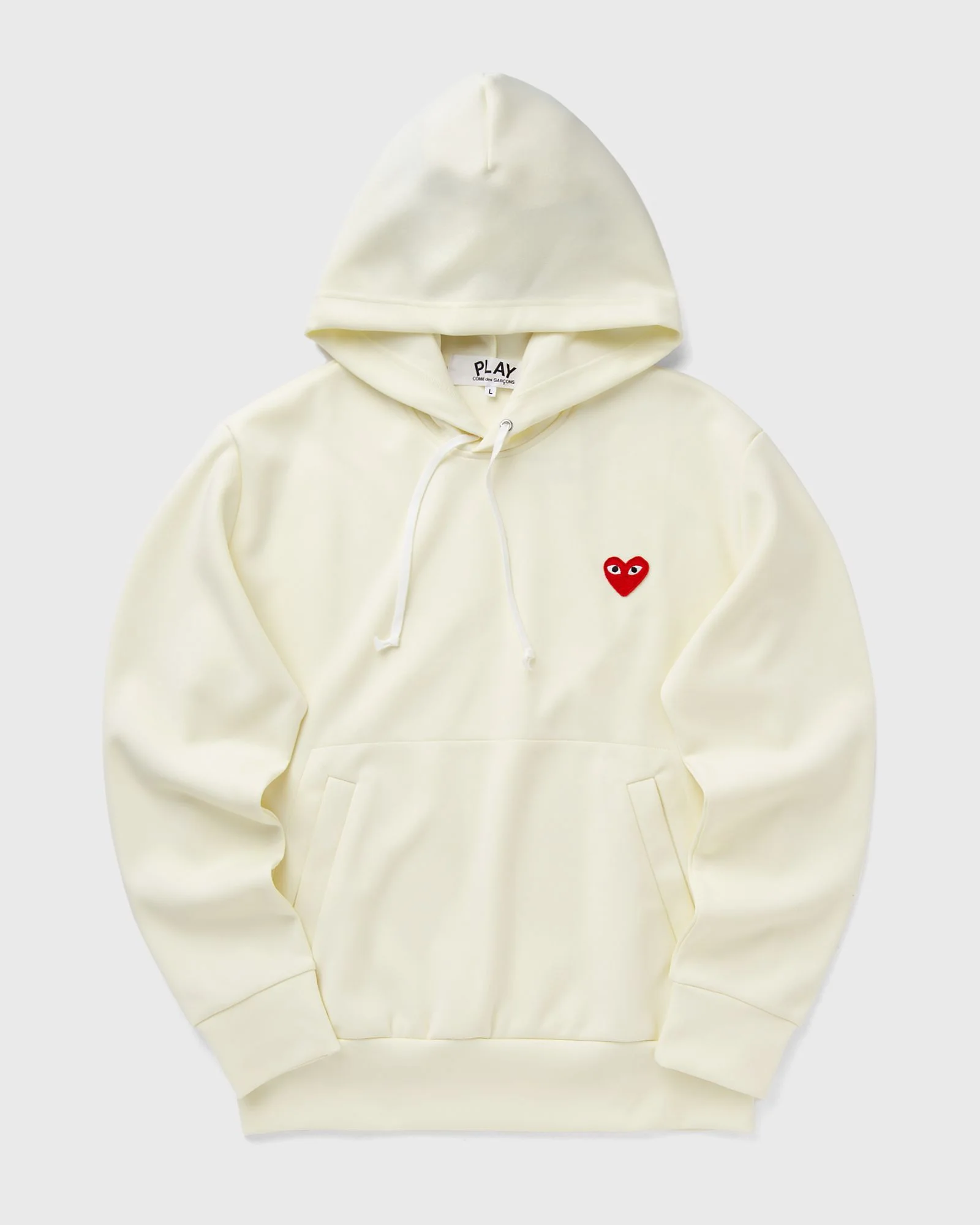 The Comme des Garcons Play hoodie combines casual sports style and avant-garde aesthetics. Made from soft material and with ribbed cuffs and hem, it is also comfortable to wear. - Adjustable hood - Side pockets - Heart print and embroidery Article number: AX-T174-051-3 Gender: men,women Color: IVORY Material: 100% Polyester