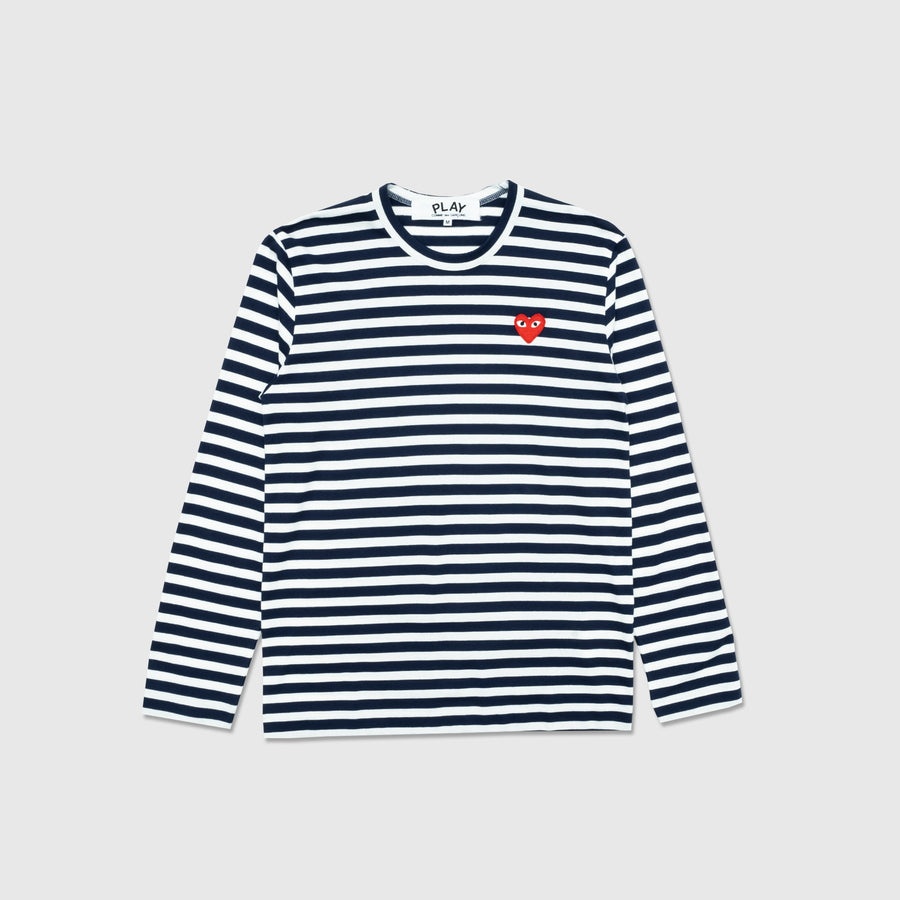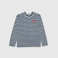 - AZT0100511DKRY - Dark Royal/White - 100% Cotton - Made in Japan - Crewneck Collar - Long-Sleeved Striped T-Shirt - Heart Applique - Crewneck Collar - Please note that this garment runs small. We suggest sizing up one size for a more true fit