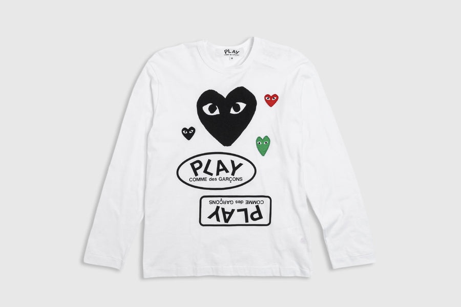 - AZ-T286-051-1WHT - White/Black-rd-grn - 100% Cotton - Made in Japan - Crewneck collar - Patch heart applique - Screen-printed heart and logo branding
