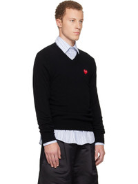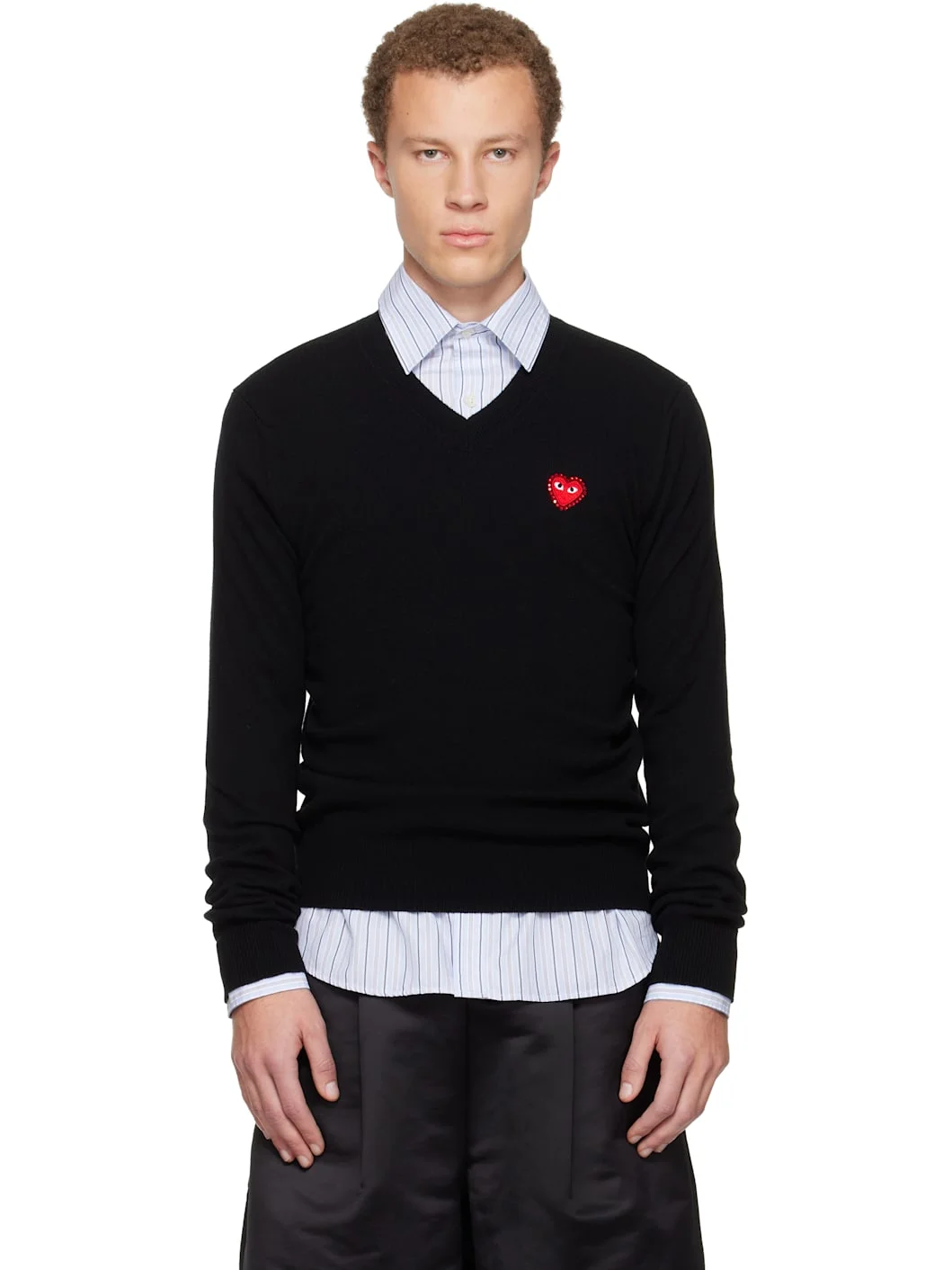 Knit wool sweater. · Rib-knit V-neck, hem, and cuffs · Embroidered logo patch and crystal-cut accents at chest Supplier color: Black 100% wool. Made in Japan 252246M206001